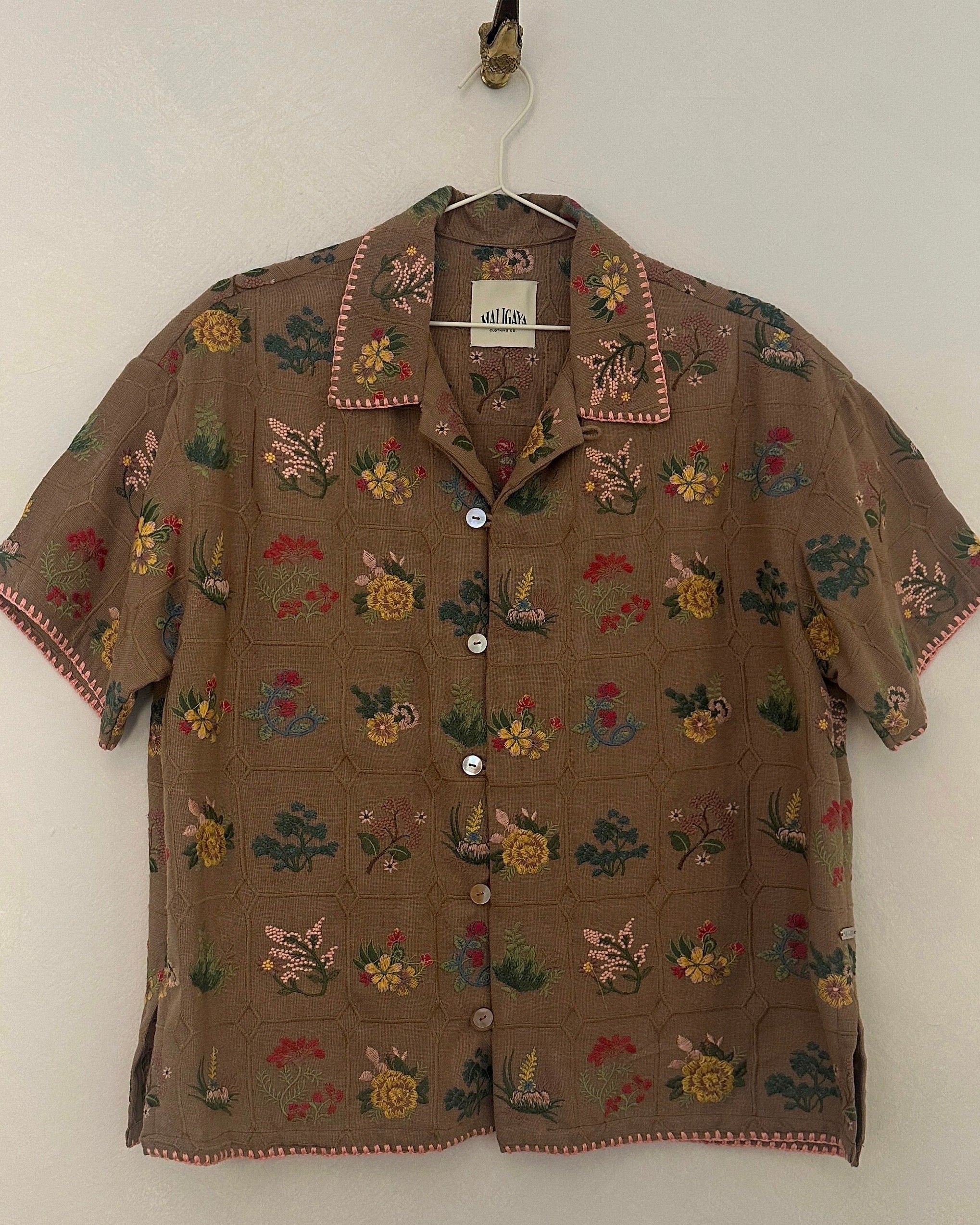 DESCRIPTION:•Cuban collar short sleeve •Handmade from botanical embroidered fabric•Detailed floral embroidery •Hand sewn...