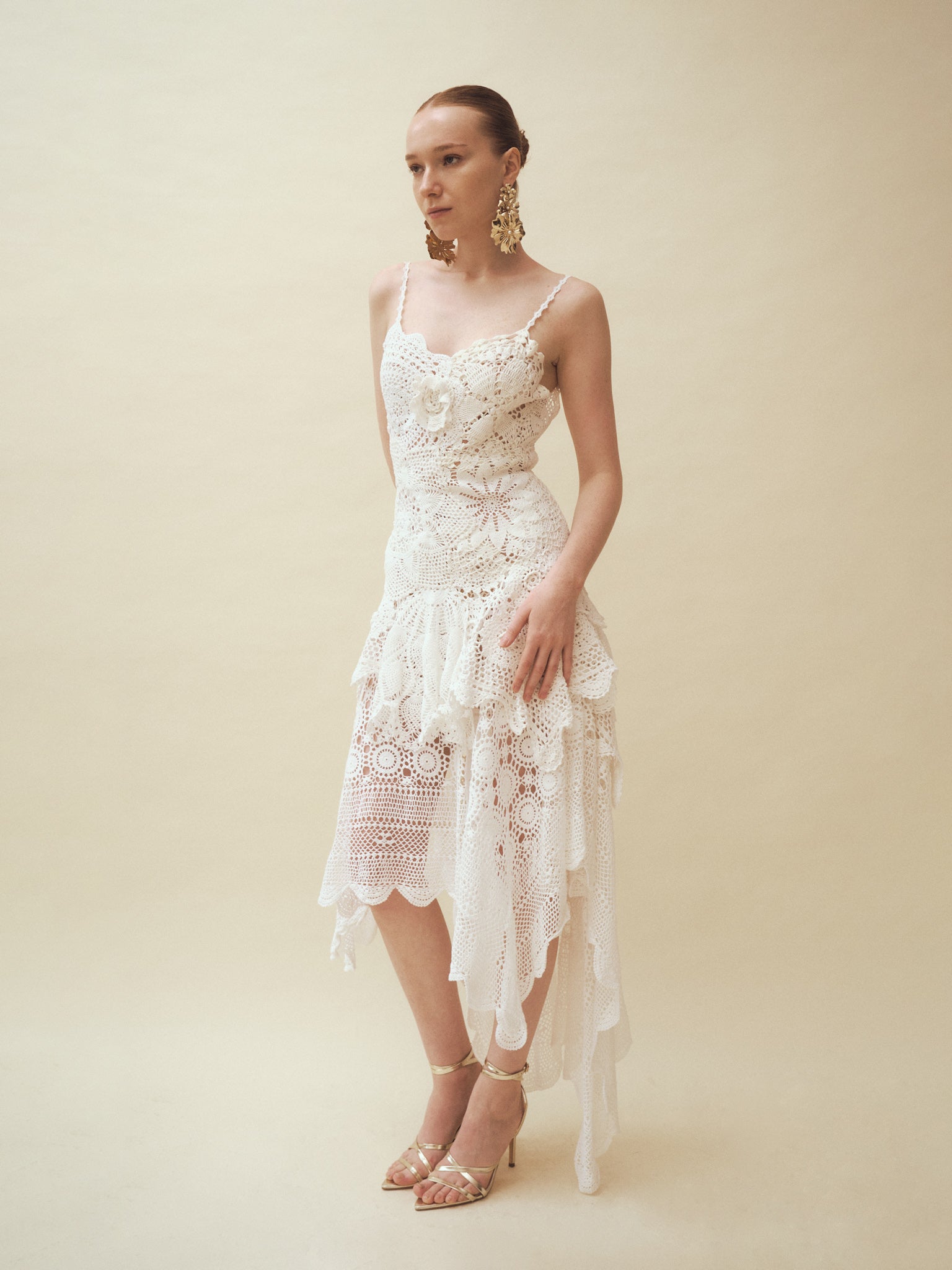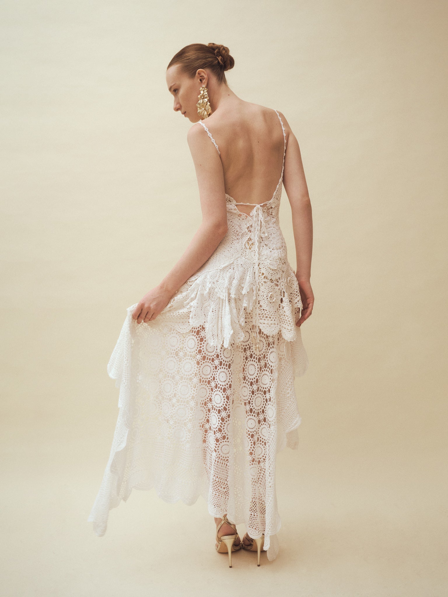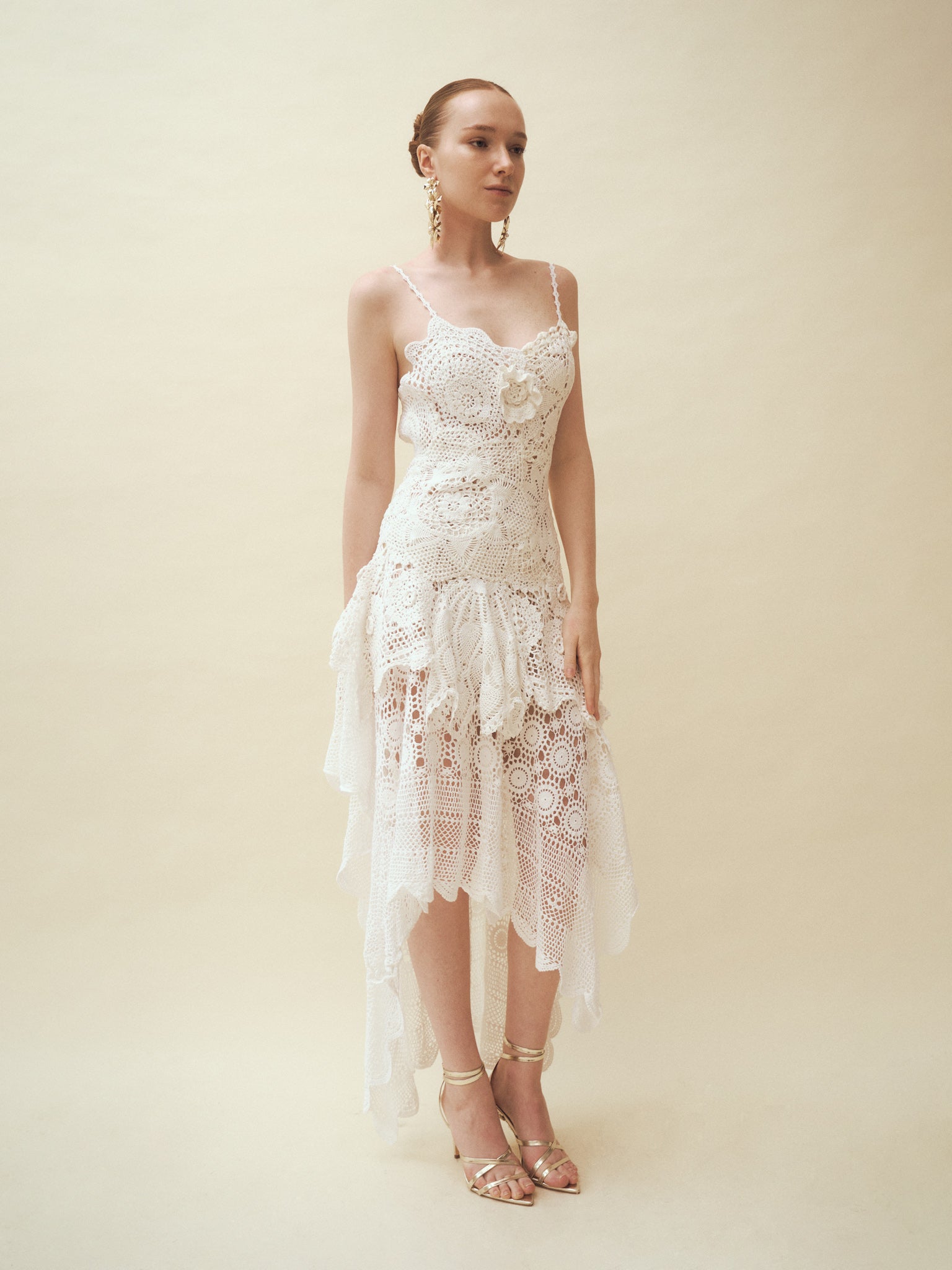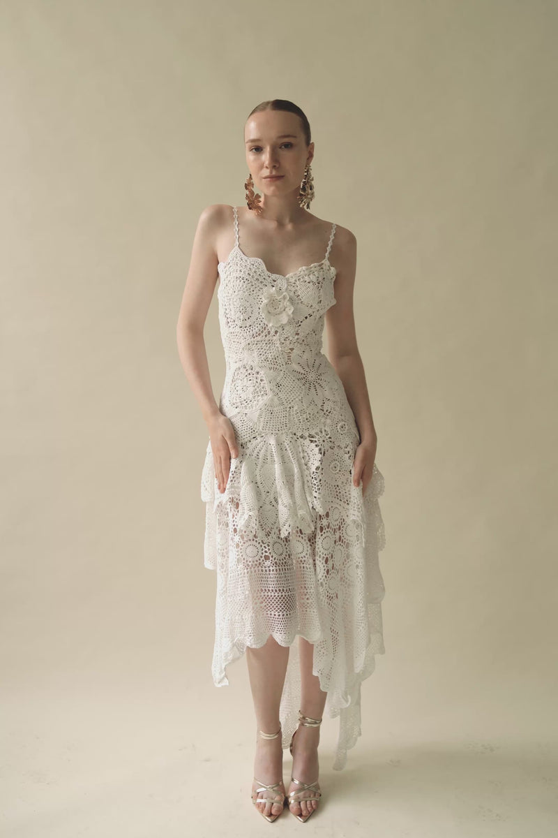 Handcrafted from repurposed vintage crochet doilies layered with different lace tablecloths, this piece is photographed in its current condition. The model is 175 cm tall, wears a size S, and measures 32–24–36 inches.