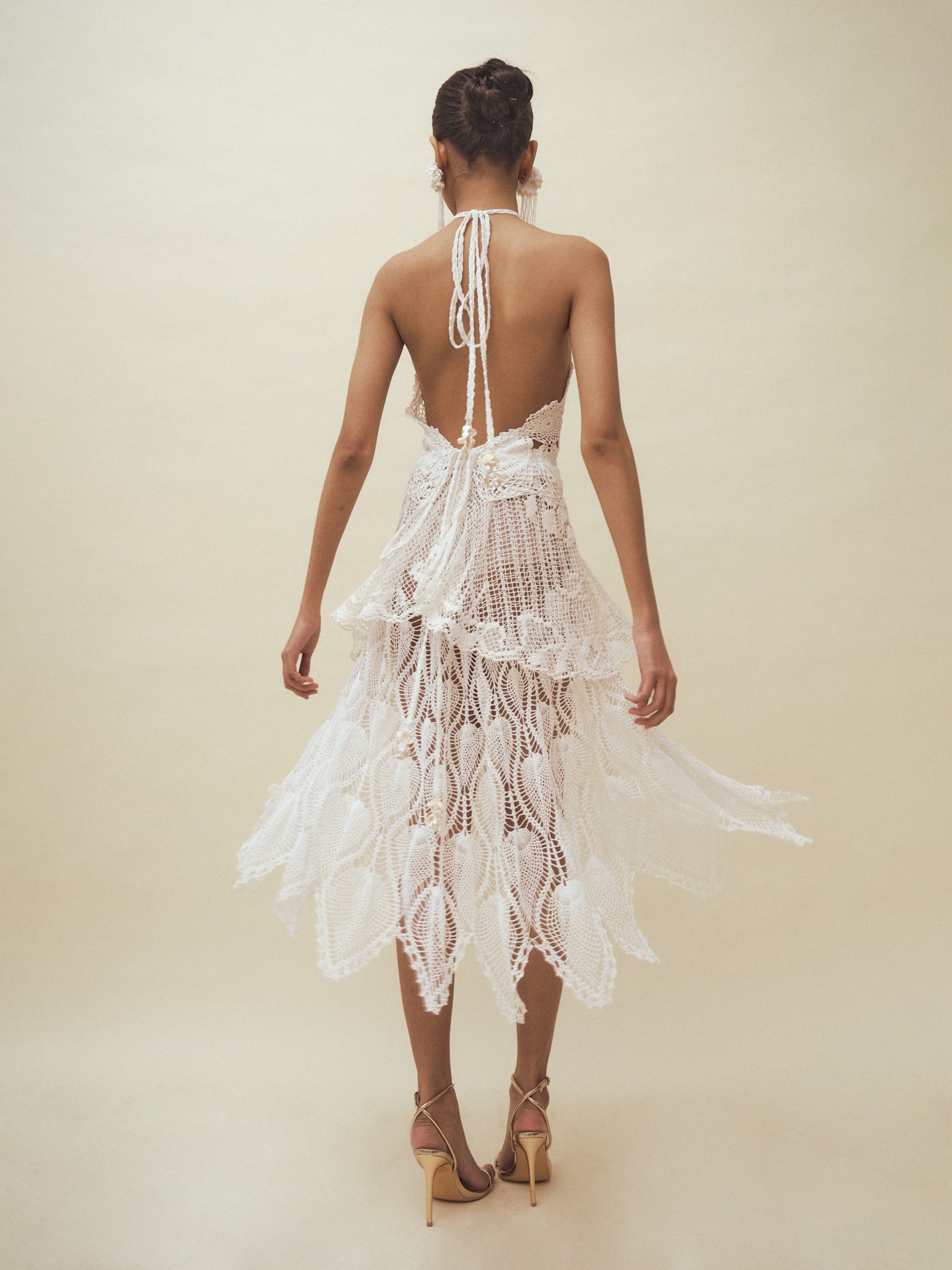 Handcrafted from repurposed vintage crochet doilies, this piece is photographed in its current condition. The model is 175 cm tall, wears a size S, and measures 32–24–36 inches.