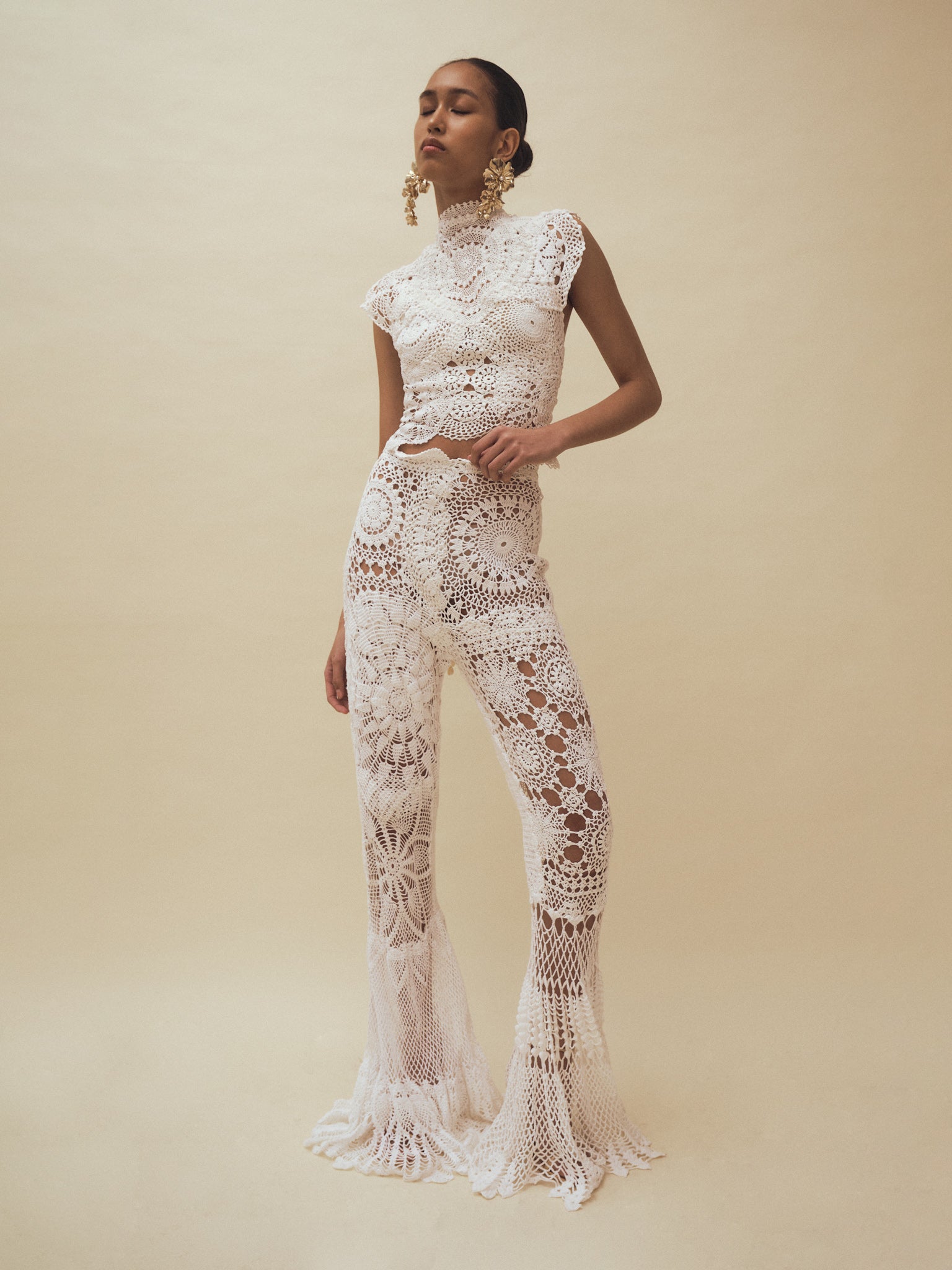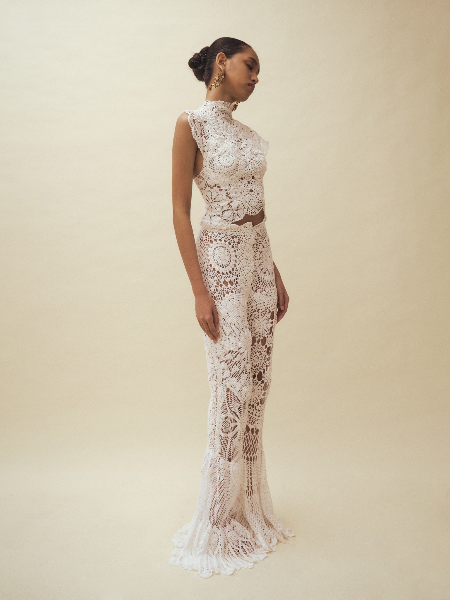 Handcrafted from repurposed vintage crochet doilies, this set is photographed in its current condition. The model is 175 cm tall, wears a size S, and measures 32–24–36 inches.